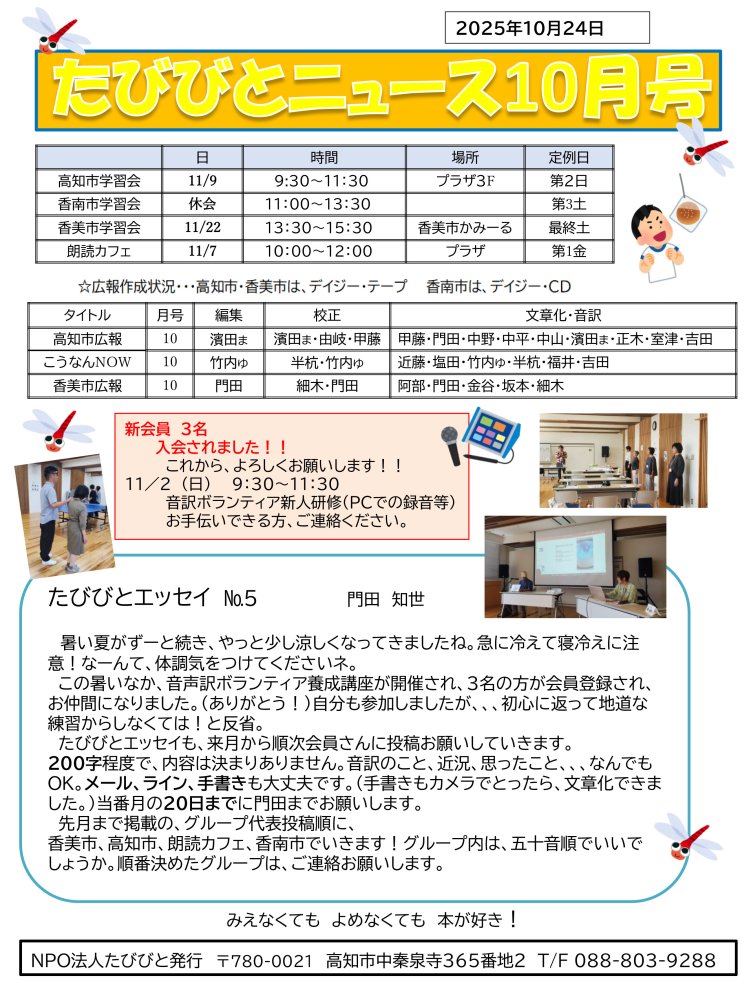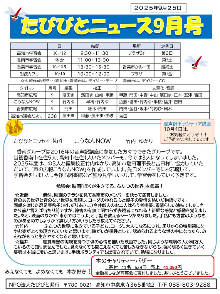 今回は9月の日程、定款変更の登記終了、音声訳ボランティア講座、エッセイなど掲載しています。